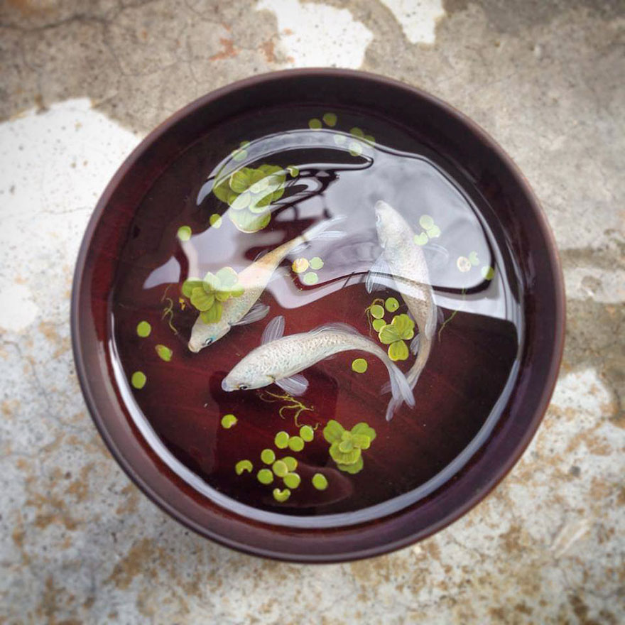 Lye’s method is a brilliant bit of trickery. By pouring layers of crystal-clear synthetic resin and painting on it, he creates the illusion that what we’re actually looking at is a bowl with a fish or a turtle in it.